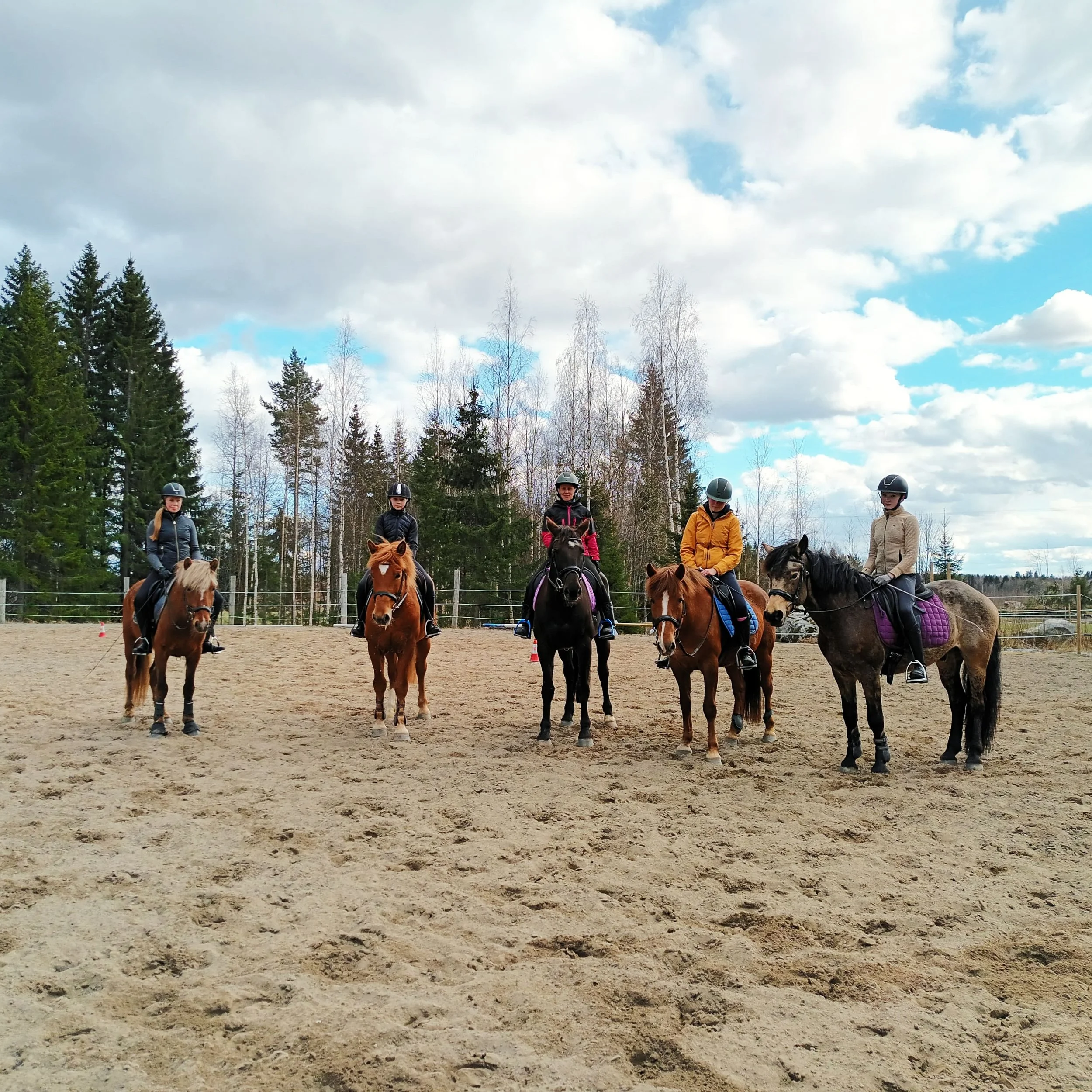 Voit lainata tallilta kypärän. Meillä on myös erikokoisia kumisaappaita ratsastusta varten. Hyvät ratsastuskengät tukevat ratsastajan nilkkaa ja niissä on hyvä korko, jotta jalka ei pääse luiskahtamaan jalustimen läpi. Sileäpohjaisilla (kannattomat) kengillä ei pääse meillä ratsastamaan ollenkaan.